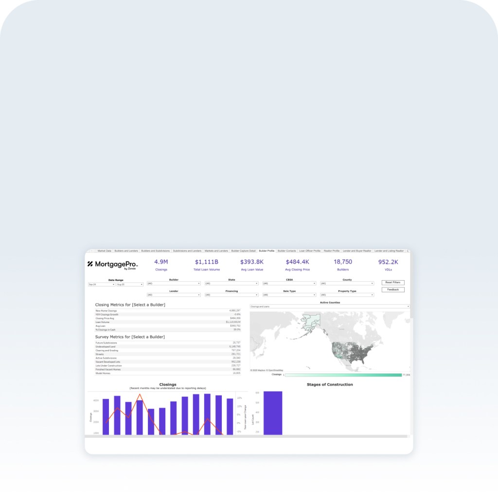 MortgagePro delivers unmatched visibility into builder, lender, and loan officer performance, so you can prospect smarter, recruit faster, and close more loans in the new residential construction market.