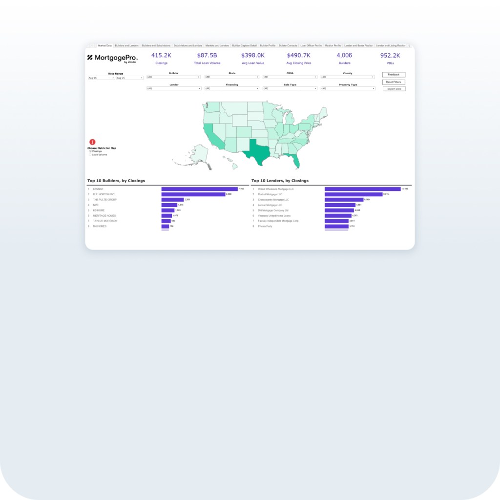 Maximize your market share with features such as loan officer profiles, builder capture details, builder profiles, builders and subdivisions, builder/lender activity, and market trends.