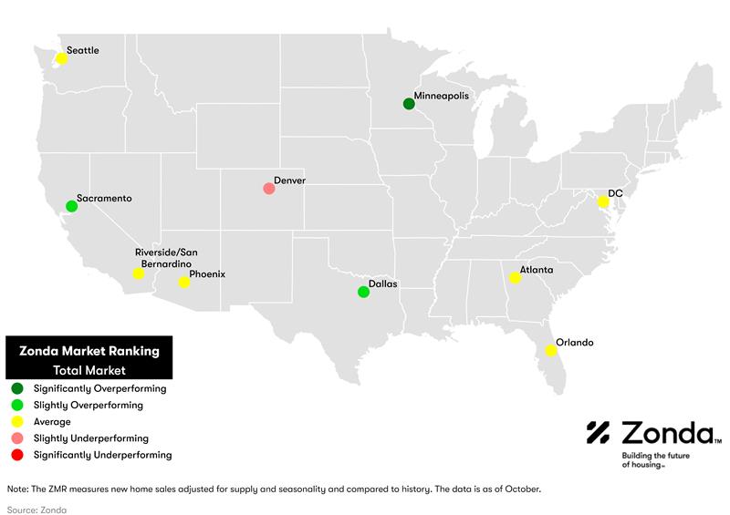 In order to add further context to sales, Zonda created the Zonda Market Ranking (ZMR). The ZMR accounts for both sales pace and volume, is seasonally adjusted, and is taken as a percentage relative to a baseline market average. Based on the percentage above or below baseline, markets are bucketed into performance groups ranging from significantly underperforming to significantly overperforming relative to historical activity.